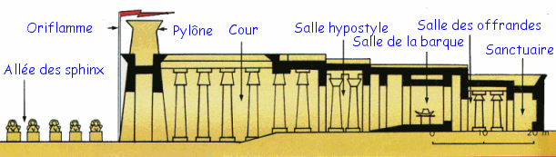 5- Pylônes est l'élément le plus massif. Le pharaon utilise donc cet espace pour sa gloire et sa propagande. la façade et l'entrée du temple. Ses deux tours rectangulaires dont les murs sont obliques encadrent la porte de granite du temple